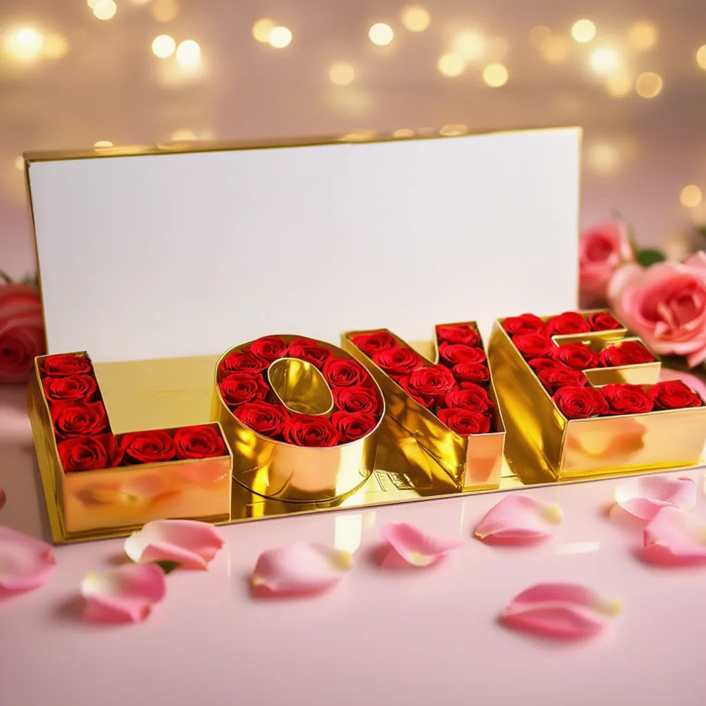 A stunning love-shape metallic box filled with 50 fresh red roses. Designed for proposals, anniversaries, and unforgettable Valentine surprises.